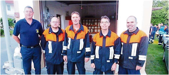 Bild (r.): Die Kommandanten der teilnehmenden Wehren (v.r.) Andreas Birkeneder (Aicha a. d. Donau), Markus Friedl (Thundorf), Michael Wagner jun. (Niedermünchsdorf) und Robert Kröll (Haardorf) zusammen mit Kreisbrandmeister Armin Zitzelsberger (l.). Foto: Rolf Schwinger