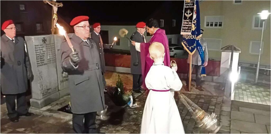 Haardorf. (rs) In der Pfarrkirche St. Martin hielt Pfarrvikar Pater Kuriakose Kuzhikattu Mani C.M.I. am Wochenende den Gottesdienst für die gefallenen und vermissten Soldaten beider Weltkriege. Den Lektorendienst übernahm Festmutter Martina Brandl. Die Ansprache zum Gedenkakt hielt in Vertretung der Stadt Osterhofen Stadtrat Robert Kröll. Er mahnte, dass es wichtig ist, sich an Vergangenes zu erinnern, auch wenn die Bereitschaft zu einer Erinnerungskultur immer mehr schwinde. „Oft gibt es nur noch ein ‘Ich’. Aber Probleme in Deutschland, in Europa und in der Welt sind nur miteinander zu lösen. Wenn wir nicht wollen, dass unsere Kinder wieder in einen Krieg ziehen, müssen wir handeln und uns allen Kriegstreibern in den Weg stellen.“ Auch wenn sich die Politik für Frieden, Freiheit und Demokratie einsetzen müsse, so müsse die Grundlage dafür in der Familie, im Kindergarten, in der Schule und auch im Dorf geschaffen werden. Jetzt, 92 Jahre später, seien wieder Kräfte am Werk, die die Demokratie aushebeln wollen. „Wenn wir ‘Nie wieder’ sagen, ist dies ein Sinnbild des Widerstandes. Dazu brauchen wir Kraft und Ausdauer. Wir tun dies für unsere Zukunft, für die Zukunft unserer Kinder und Enkelkinder“, mahnte Robert Kröll. Am Kriegerdenkmal sprach dann Pater Kuriakose ein Gebet und das „Vater unser“. Als Zeichen des Bekenntnisses zu Frieden, Freiheit und Demokratie stellte hierauf Stadtrat Robert Kröll zusammen mit dem Vorsitzenden des Krieger- und Veteranenvereins im Namen der Stadt Osterhofen eine Schale ab. Während der Kirchenchor das Lied vom „Guten Kameraden“ sang, senkten sich die Fahnen des Krieger- und Soldatenvereins und der Freiwilligen Feuerwehr. – Bild: Pfarrvikar Pater Kuriakose besprengte das Kriegerdenkmal mit Weihwasser; die Ehrenwache der Reservistenkameradschaft mit Josef Zauner (v. l.), Hans Dorfmeister, Günther Zauner und Josef Ammerseder. Foto: Rolf Schwinger